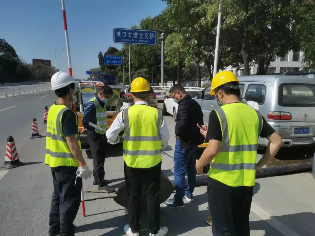 在港口大道萬江歐景城路段,巡查人員經(jīng)排查發(fā)現(xiàn)雨水管道積淤嚴(yán)重、檢查井滿水,已第一時間報告主管部門和監(jiān)理單位,并協(xié)同原運維單位進(jìn)行管道降水位和清疏工作。