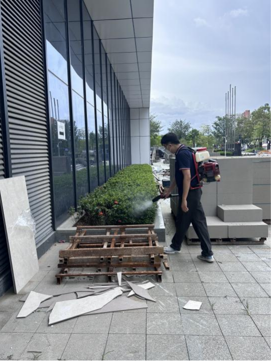 實業(yè)公司及直屬企業(yè)精準搶抓滅蚊黃金期,聚焦辦公區(qū)、食堂、在建工程等關鍵場所,以煙霧機、噴霧器聯(lián)動開展大規(guī)模藥劑噴灑。本部聯(lián)合凈水公司從7月25日起,對辦公場所實施多輪消殺,同步在易積水區(qū)域部署24小時滅蚊燈值守,并派發(fā)防蚊液等物資;眾源、置拓、尚源等直屬企業(yè)同步發(fā)力,通過委托專業(yè)團隊或聯(lián)動協(xié)作單位,對項目現(xiàn)場、排水溝渠、綠化帶等重點區(qū)域開展常態(tài)化消殺,日均藥劑噴灑與蚊香強化防控雙管齊下,織密夏日防蚊“防護網(wǎng)”。